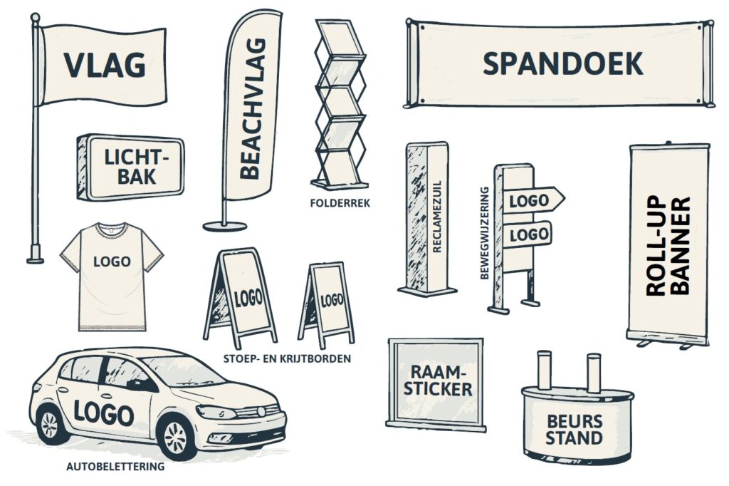 Duizenden reclame-artikelen, zoals stoepborden, vlaggen, spandoeken, banners, horecamateriaal, menuvitrines, raambelettering, reclamezuilen, kliklijsten, poster-wissellijsten, beursstands, beachvlaggen, a0-frames, spandoek in frame, menuborden, folderrek, brochurehouders, etc.